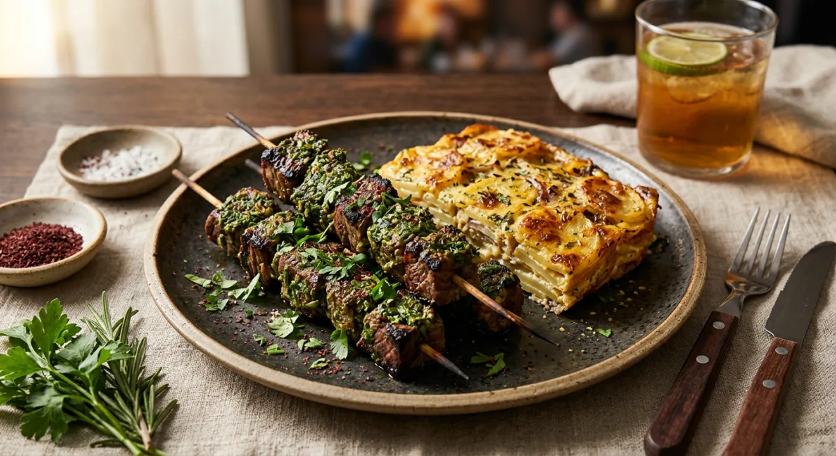 Herb-Crusted Mishkaki with Potato Gratin Mayai