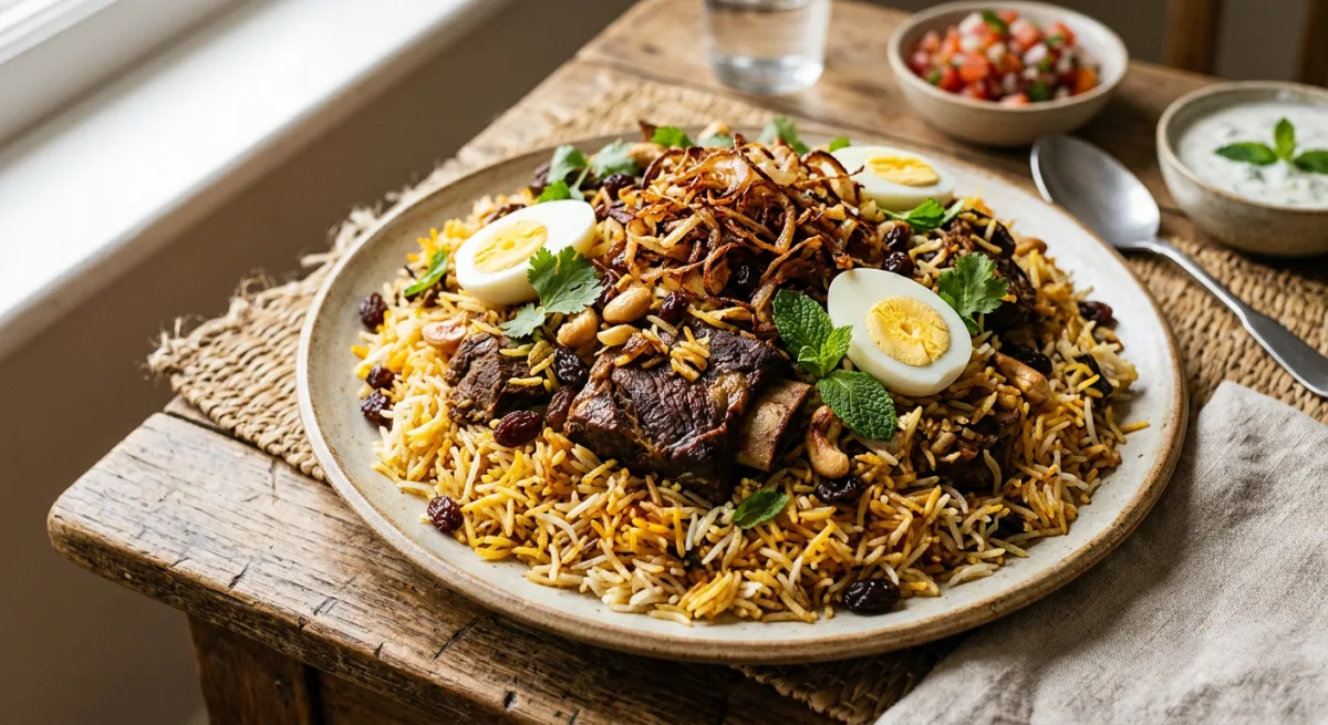 Zanzibar's coastal biryani is a spectacular layered celebration dish born from centuries of Omani trade and Swahili creativity — fragrant basmati rice stained saffron-gold layered over slow-cooked spiced beef, crowned with crispy fried onions, raisins, and halved hard-boiled eggs. The rice absorbs the complex dum-cooked steam, carrying notes of rose water, cardamom, clove, and ghee into every grain. This is feast food, built for occasions and shared at the table.