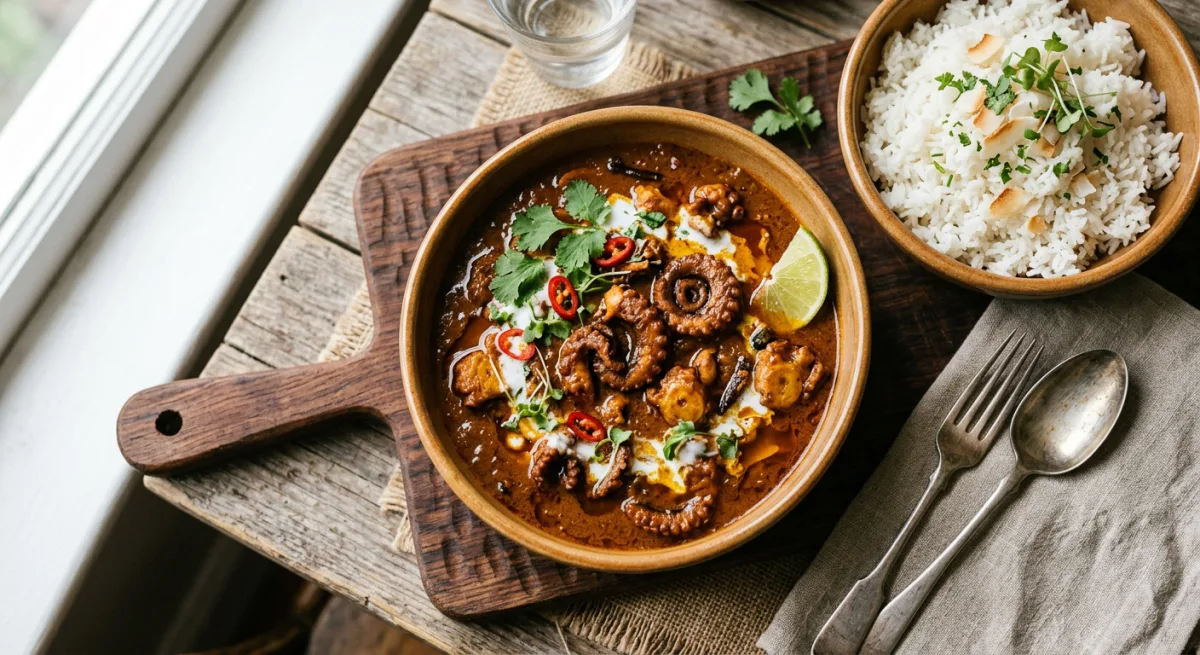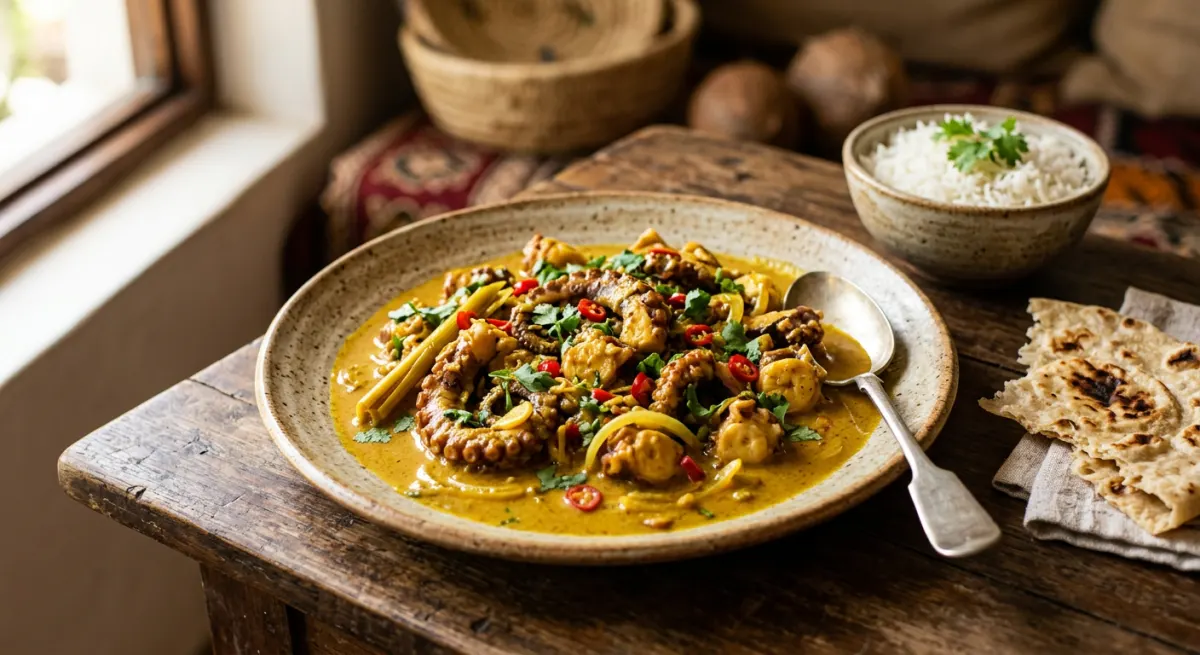 Zanzibar's coastal mastery rendered in a single extraordinary pot — locally caught octopus braised low and slow until each tentacle becomes yielding and butter-soft, suspended in a coconut milk curry enriched with cinnamon, cardamom, fresh turmeric, and tamarind that builds from fragrant sweetness to a smoldering, complex heat. The rendered coconut oil rises to the surface in amber pools as the sauce reduces to a deep, rust-colored gravy that clings to every curl of tentacle. Served over wali wa nazi — coconut rice cooked in the island's own cream — this is the showpiece of Zanzibari coastal cuisine.