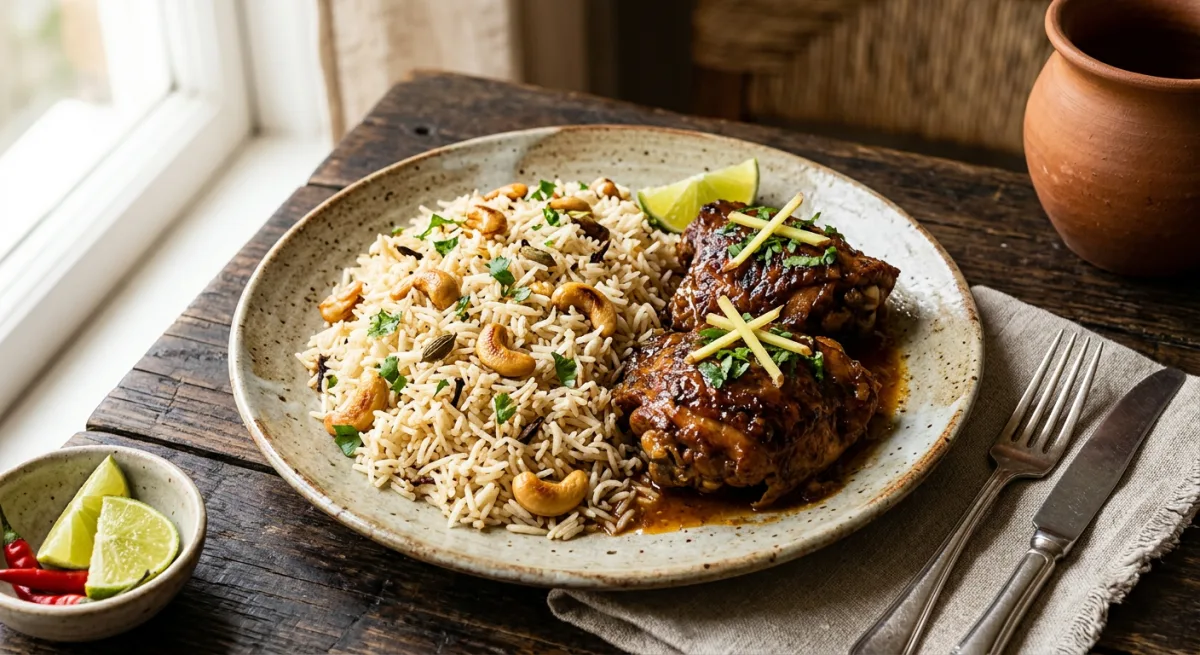 Fragrant basmati rice toasted in clarified butter and studded with golden cashews from the Mtwara coast, paired with tender chicken thighs slow-braised in a ginger-forward pan sauce perfumed with cardamom and fresh lime. A coastal Tanzanian classic elevated with restaurant-grade technique — layered, aromatic, and deeply satisfying.