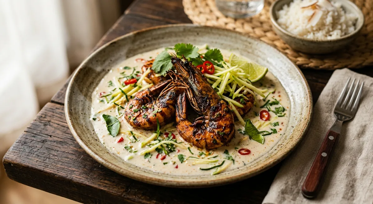 Jumbo Tanzanian coast prawns seared in a sizzling spiced brown butter until caramelised and just cooked, then finished in a velvet coconut cream sauce sharpened with grated green mango and the citrus perfume of fresh kaffir lime leaves. Every element of this dish — the butter's nuttiness, the mango's brightness, the coconut's richness — is calibrated for maximum contrast and coastal elegance.