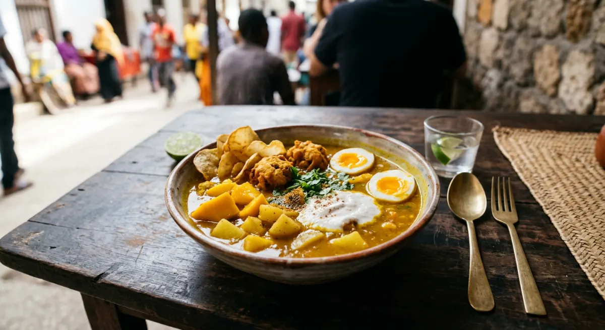 Stone Town's legendary street soup — a deeply turmeric-golden, tamarind-soured broth pungent with curry spices, carrying a curated cargo of crispy bhajia fritters, golden cassava chips, halved boiled eggs, ripe mango chunks, and a swirl of cooling coconut chutney. This is the soul of Zanzibar in a bowl: chaotic, vivid, hot, tangy, and utterly irreplaceable.