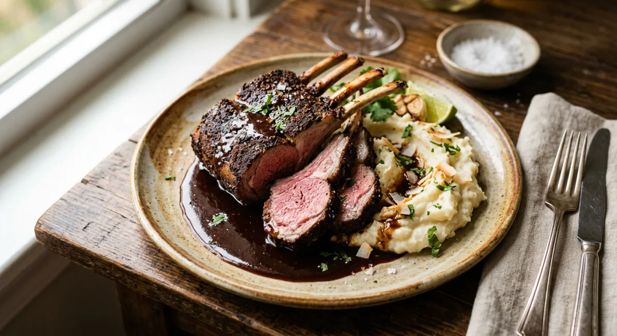A French-trimmed rack of lamb, its bones gleaming and its crust black with toasted Zanzibar spices, reverse-seared to a perfect blushing rose and rested until the juices redistribute into every fibre. A luxurious tamarind reduction — deep, sweet-sour, and glossy as lacquer — anchors the plate alongside cloud-soft coconut-mashed cassava enriched with roasted garlic butter. This is where the spice archipelago meets the modern kitchen.
