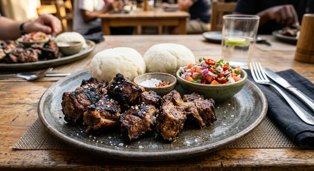 Nyama choma — fire-roasted meat — is the cornerstone of East African communal eating, and goat ribs cooked over wood coals represent its most prized expression. The ribs are marinated in a punchy blend of garlic, lime, and chili, then charred over intense heat until the exterior is deeply caramelized and the interior is succulent and smoke-perfumed. Kachumbari, the brilliant sharp salsa of raw tomato, red onion, fresh cilantro, and lime, cuts through the richness with every bite — it is indispensable.