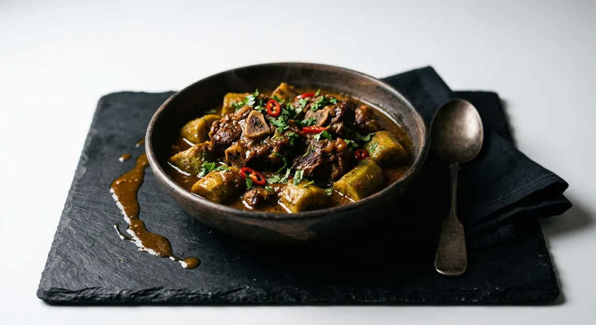 One of East Africa's great slow-cooked comfort dishes — bone-in goat braised until the collagen melts into the sauce, then married with firm green plantains that absorb the spiced coconut and tomato broth while releasing their starch to build a glossy, naturally thickened gravy of extraordinary depth. The ginger and ground coriander create a warmth that builds gently, while the coconut milk rounds every edge to a luxurious, silky finish. This is the kind of stew that transforms a humble kitchen into the most important room in the house.