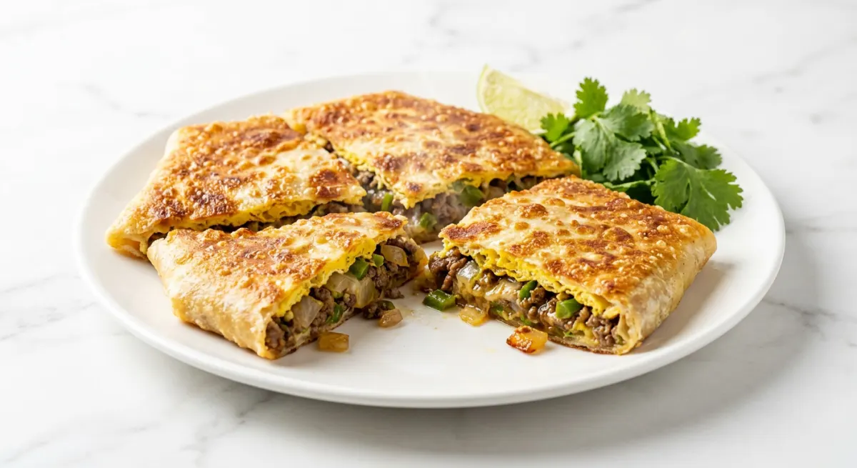 Zanzibar's most theatrical street-food spectacle — paper-thin dough is stretched almost translucent, then laden with spiced minced beef, fresh egg, diced vegetables, and a scatter of cheese before being folded into a sealed envelope and fried in a pool of butter until the exterior turns a burnished, crackling gold while the interior steams into a layered, molten filling. Each pizza is made to order, cut open tableside with scissors in a burst of steam, revealing the glistening, egg-rich interior that runs together with the spiced meat and caramelised onions. Eaten standing, wrapped in newsprint, at Forodhani Night Market — or plated beautifully as the showpiece it deserves to be.