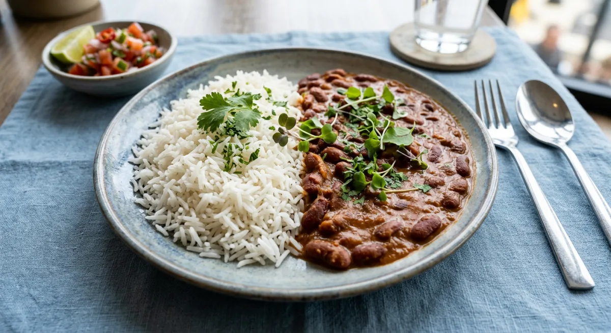 Tanzania's most beloved daily meal elevated to its finest expression, featuring creamy red kidney beans slow-cooked in rich coconut milk with ripe tomatoes, warm spices, and aromatics. The silky, deeply flavored stew is ladled alongside perfectly steamed long-grain white rice, each grain separate and fluffy, creating a nourishing and complete dish that speaks to the soul of East African home cooking. This is comfort food at its most honest and satisfying.