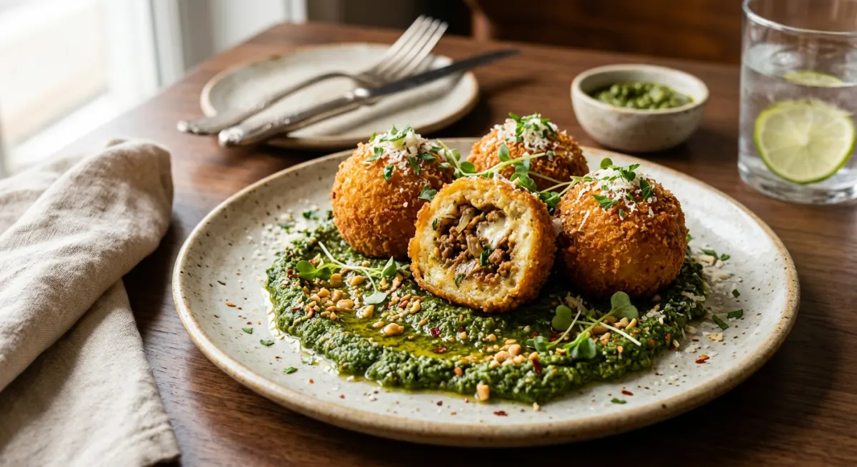 A bold and inventive East African-Italian fusion where Tanzania's iconic ugali is reshaped into golden, shatteringly crispy arancini balls, each one concealing a savory filling of warmly spiced ground beef and caramelized onions. Served alongside a vibrant, nutty pesto blended from sautéed sukuma wiki (Tanzanian collard greens), roasted garlic, crunchy peanuts, and bright lime juice — a sauce that is entirely East African in soul. This dish bridges tradition and modernity with confidence and delicious results.