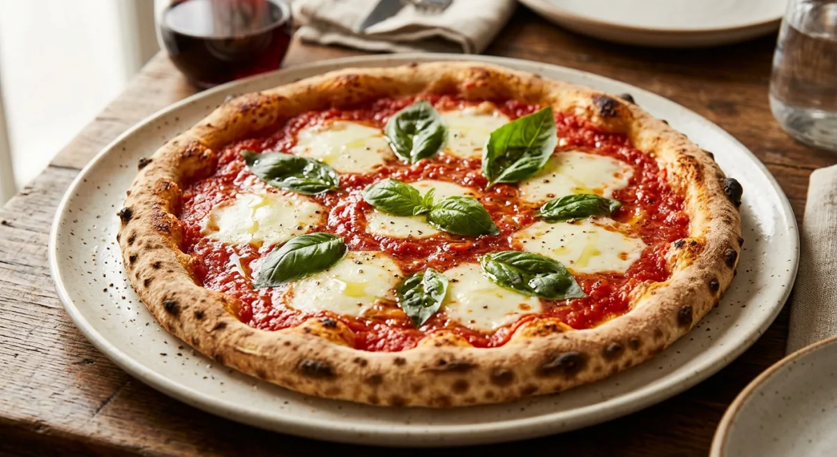 Naples' most iconic export — a thin, blistered crust charred at the edges and pillowy at the center, smothered in sweet San Marzano tomato sauce and crowned with torn fior di latte mozzarella that melts into creamy pools. Finished tableside with fresh basil and a flourish of cold-pressed extra virgin olive oil, this is simplicity elevated to an art form.