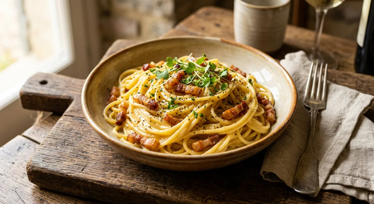 Rome's most debated and beloved pasta — silken strands of spaghetti coated in an impossibly creamy sauce made with no cream whatsoever, relying instead on the precise emulsification of eggs, aged Pecorino Romano, and starchy pasta water. The sauce clings to every strand, punctuated by amber shards of crispy guanciale and a fierce grinding of black pepper that defines the dish.