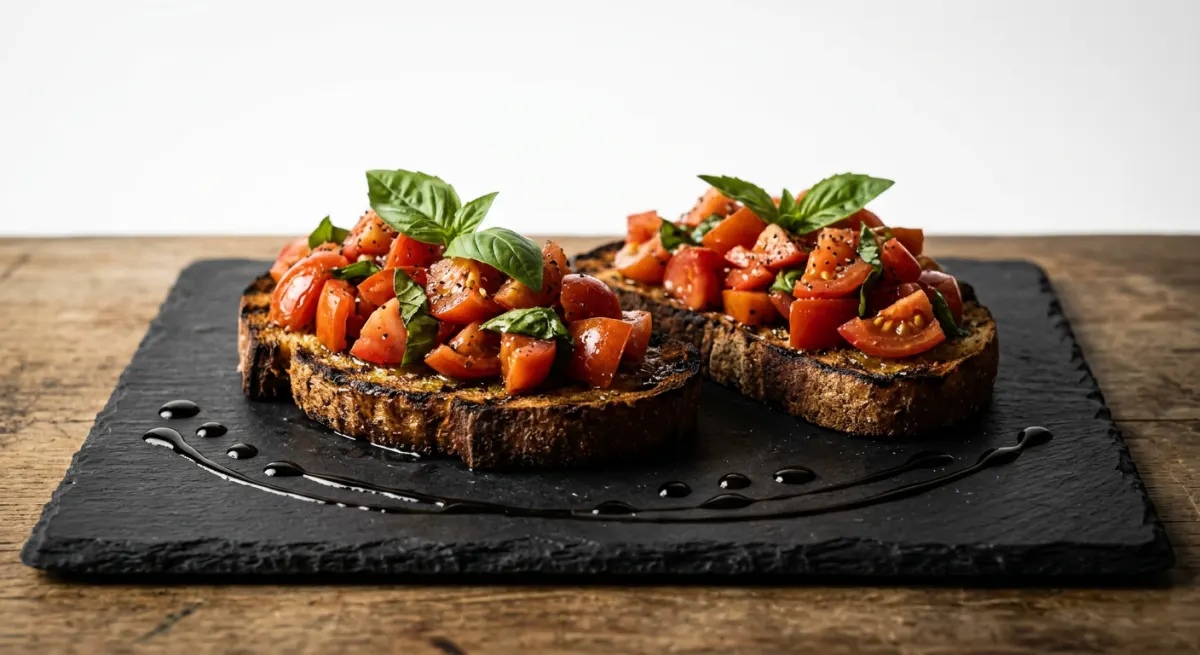 The definitive Italian antipasto — thick slices of rustic sourdough or Tuscan bread grilled directly over flame until charred and crunchy, then aggressively rubbed with raw garlic and drenched in peppery olive oil. Piled high with ripe, lightly seasoned summer tomatoes macerated with fresh basil, this is Italian peasant cooking at its most confident and satisfying.