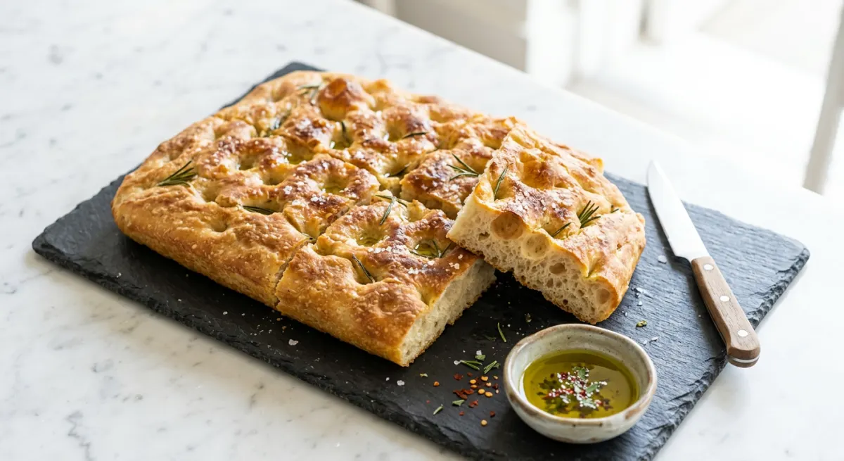 The Ligurian original — a thick, dimpled flatbread with a lacy, golden crust that shatters on the outside and yields to an impossibly tender, pillowy, olive-oil-soaked interior. Made using a slack, high-hydration dough stretched onto an oil-pooling sheet pan, then pressed with all ten fingers to create the characteristic craters that trap herb-scented brine before baking.