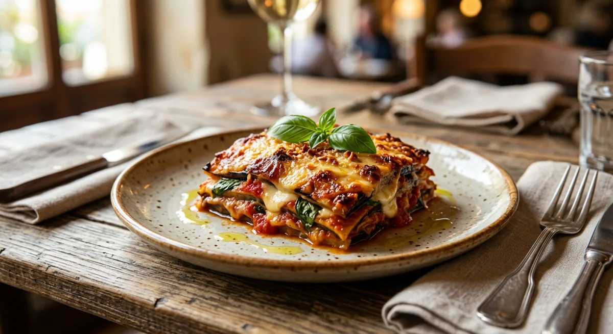 A deeply soulful Neapolitan classic where slow-roasted eggplant slices are layered with a long-simmered San Marzano tomato sauce, torn fresh mozzarella, fragrant whole basil leaves, and an extravagant snowfall of Parmigiano-Reggiano, then baked until the layers meld into a silky, quivering timbale that holds its shape on the plate. Each forkful delivers velvet-soft eggplant, tangy-sweet sauce, and the pull of melted cheese in perfect harmony. This is Italian comfort food at its most elemental and satisfying.