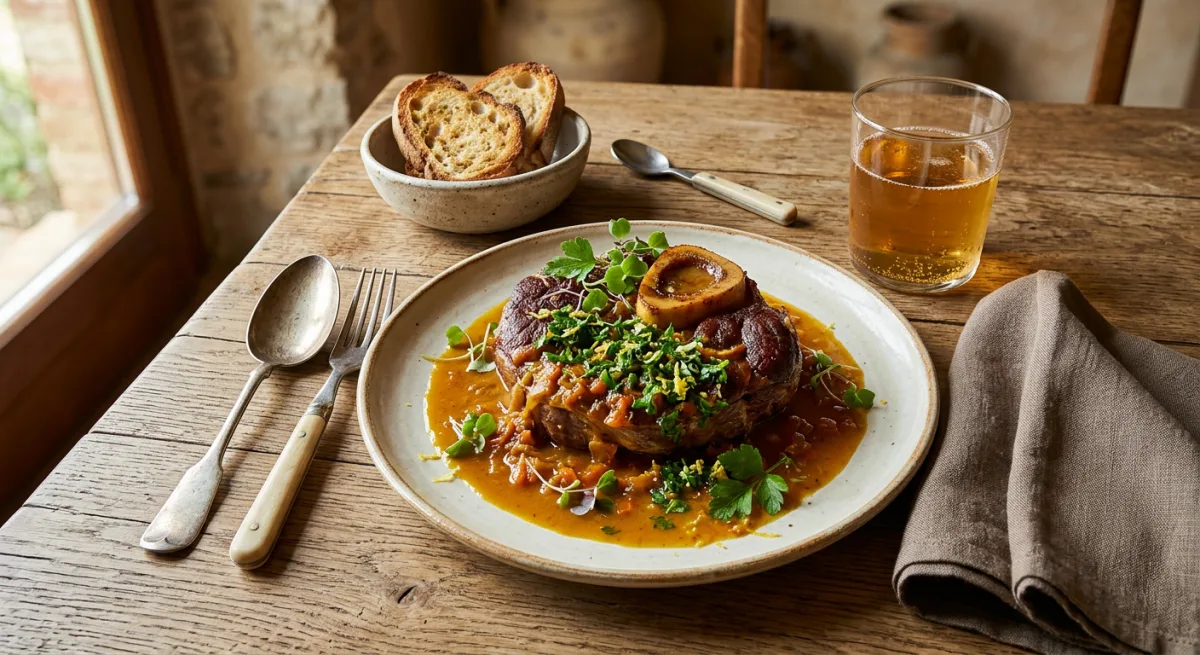 Milan's crown jewel of braised cookery — thick cross-cut milk-fed veal shanks seared to a mahogany crust, then surrendered to a slow braise in dry white wine, saffron-gilded veal broth, and a fragrant soffritto of celery, carrot, and onion until the collagen dissolves into a lustrous, clinging glacé that coats the back of a spoon. The marrow in the bone's cavity — la midolla — is the chef's reward, scooped with a narrow spoon and spread on toasted bread. A final scattering of bright gremolata cuts through the richness with the snap of lemon zest, raw garlic, and flat-leaf parsley.
