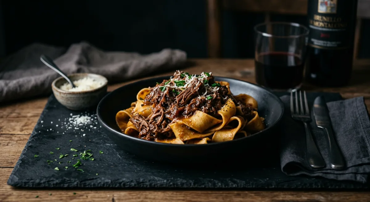 A triumphant Tuscan wild boar ragù from the Maremma — bone-in boar shoulder braised for six unhurried hours in Brunello di Montalcino with juniper berries, rosemary, black peppercorns, and San Marzano tomatoes until the connective tissue surrenders entirely and the meat becomes an impossibly rich, complex, shredded masterpiece. The wine-dark sauce, deep with game and forest aromatics, is draped over hand-rolled bronze-die pappardelle, their rough surface and wide ribbons capturing every drop of the braise. This is a dish that demands patience and rewards it extravagantly.