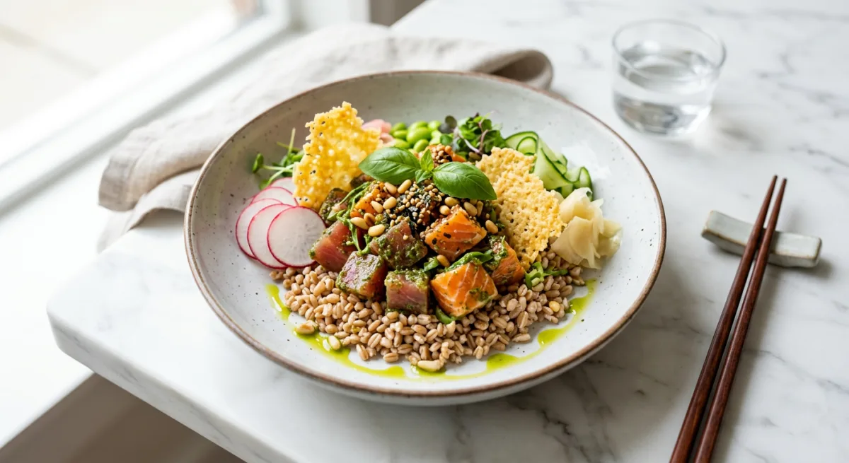 A bold and joyful East-meets-West fusion bowl where the bright, herbaceous soul of Liguria collides with the clean, raw precision of Japanese poke — silky sushi-grade tuna and salmon cubes marinated in a luscious basil pesto-ponzu dressing that bridges the Mediterranean and the Pacific in a single, harmonious bite. Layered over nutty pearled farro, the bowl is crowned with pine nut furikake, shatteringly crisp Parmigiano crisps, shaved radish, and a final drizzle of lemon-kissed extra virgin olive oil vinaigrette. It is light, deeply flavored, unexpected, and entirely addictive.